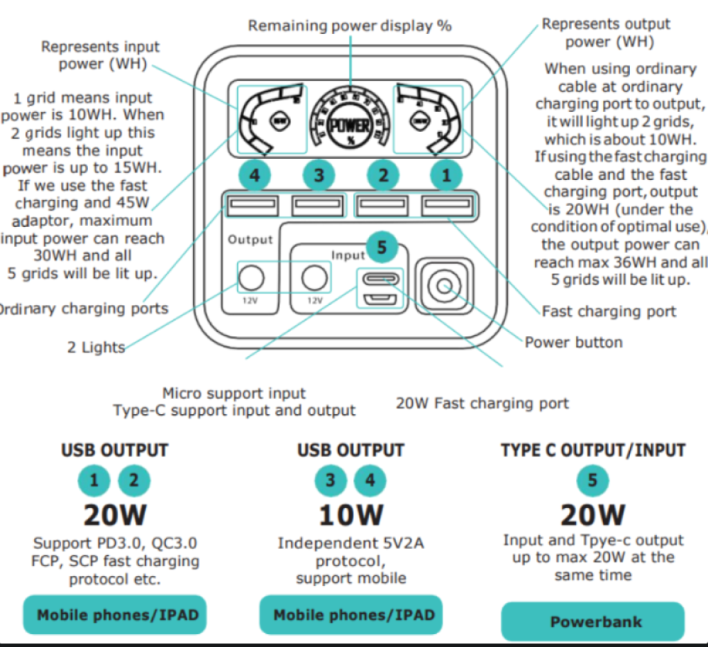 1 Type C 36W - для швидкої зарядки PowerBank або зарядки інших пристроїв від Powerbank. Повна зарядка до 8 годин.