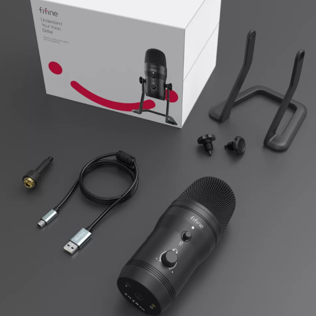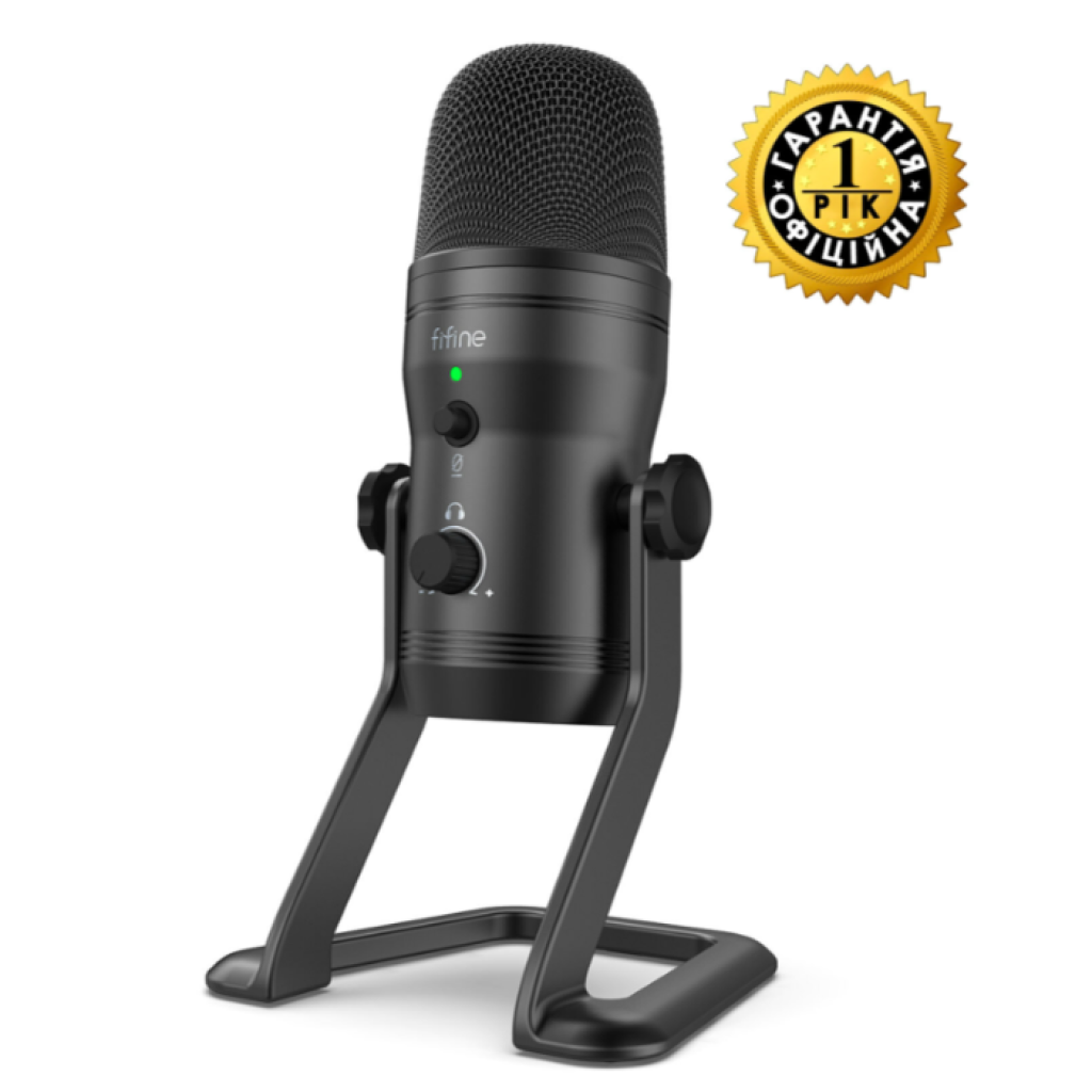 Мікрофон Fifine K690 є ідеальним вибором за своїм функціоналом. На лицьовій стороні мікрофону знаходиться кнопка відключення звуку і ручка регулювання гучності навушників. На задній панелі знаходиться регулятор рівня посилення мікрофона і нова додана кнопка для вибору діаграмами спрямованості. На нижньому боці знаходиться роз'єм для навушників. Виготовлений в металевому корпусі. Зручна підставка. Підключення до комп'ютера відбувається дуже легко і просто за рахунок Plug аnd Play. Не потрібно встановлювати додаткових драйверів. Отже, підключай та записуй!